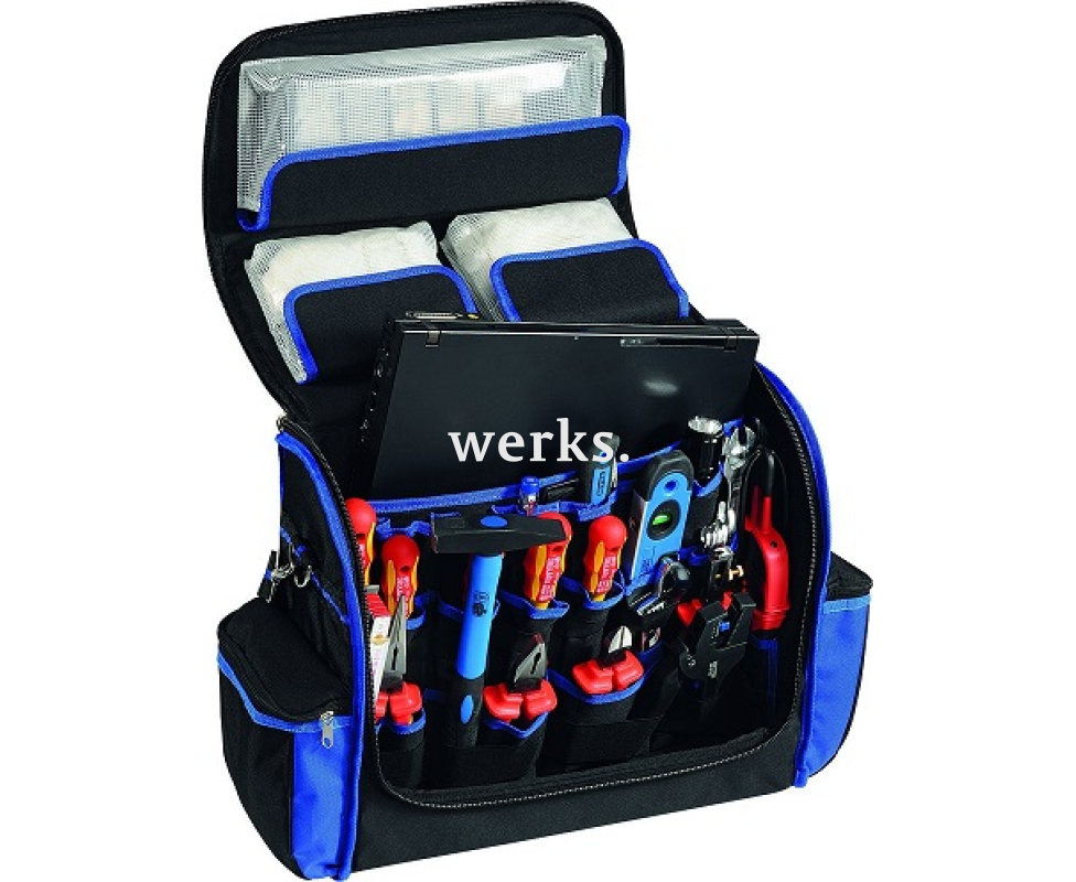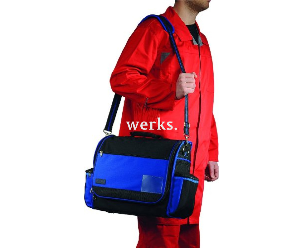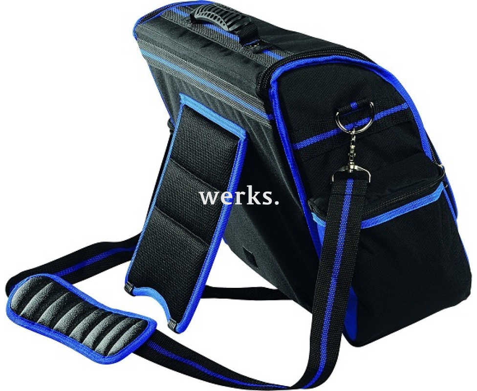 Многофункциональная сумка высшего качества, изготовленная из прочного текстиля. Оснащена системой блокировки отделений. Идеально подходит для хранения всех типов ручных инструментов. Имеет регулируемый по длине мягкий и прочный наплечный ремень. Включает специальные карманы для ноутбука и документов. Дополнительно снабжена подставкой, что позволяет использовать сумку в качестве стенда.