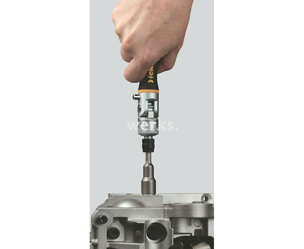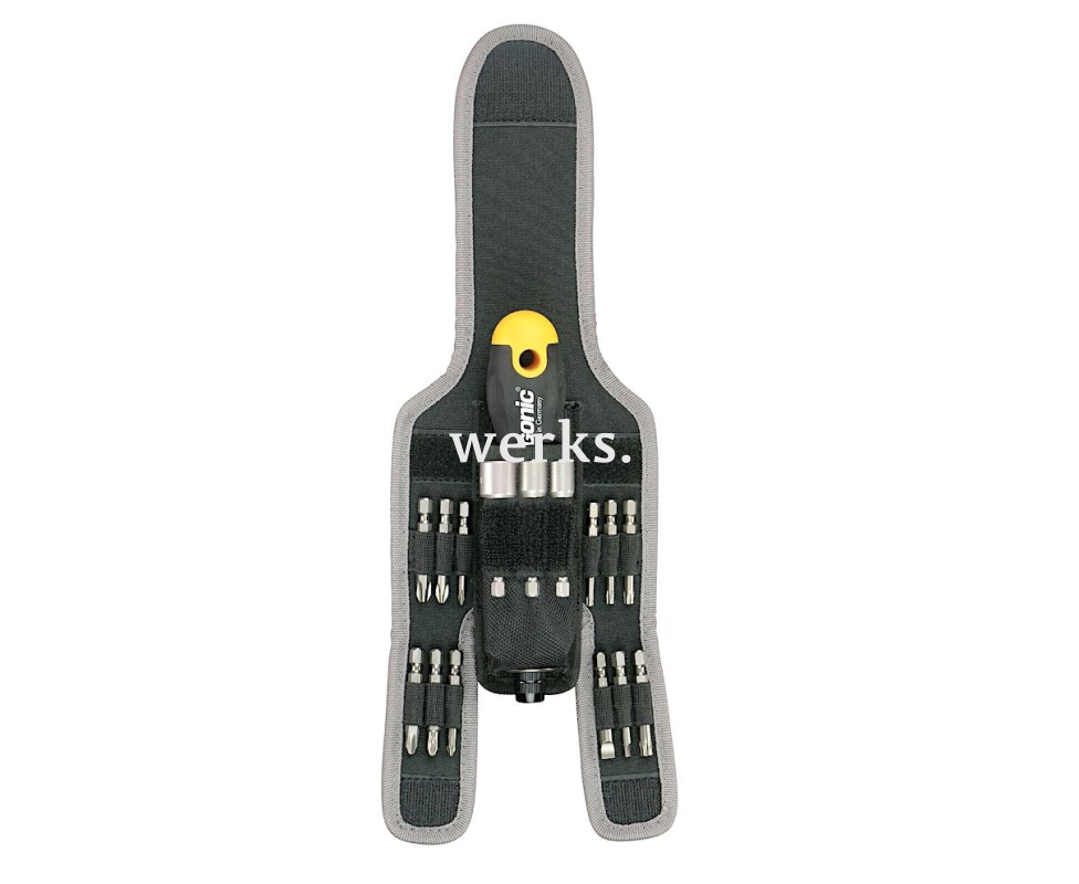 В комплекте бит Industrial находятся 2 шлицевые, 3 крестовые Phillips, 3 крестовые Pozidriv, 4 TORX, а также 3 торцевые головки HEX Nut Felo и поворотная трещотка Felo ERGONIC K с быстрозажимным патроном и моментом затяжки до 50 Нм. Упаковано в компактную поясную сумку с отделениями для бит.
