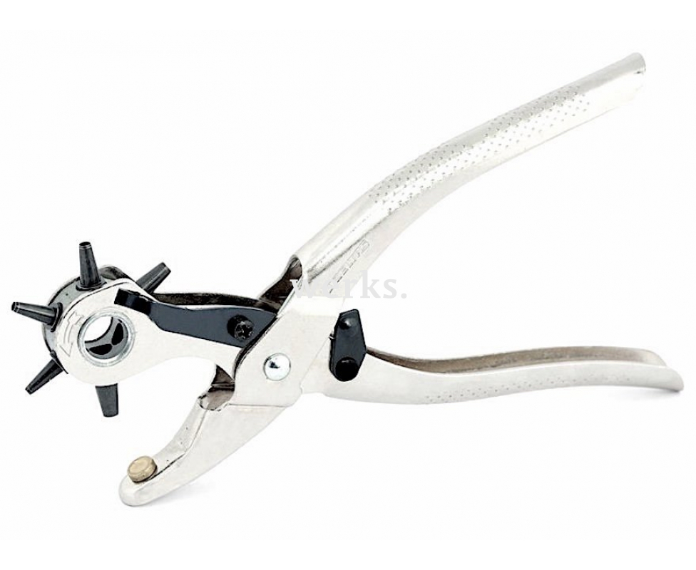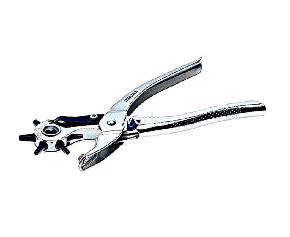 Профессиональные просечные клещи с револьверной головкой, длина которых составляет 225 мм, а вес — 270 г. Они изготовлены из прочной листовой стали. Инструмент револьверного типа оснащен шестью поворотными пуансонами разных диаметров.