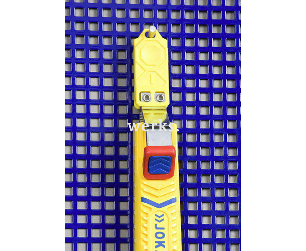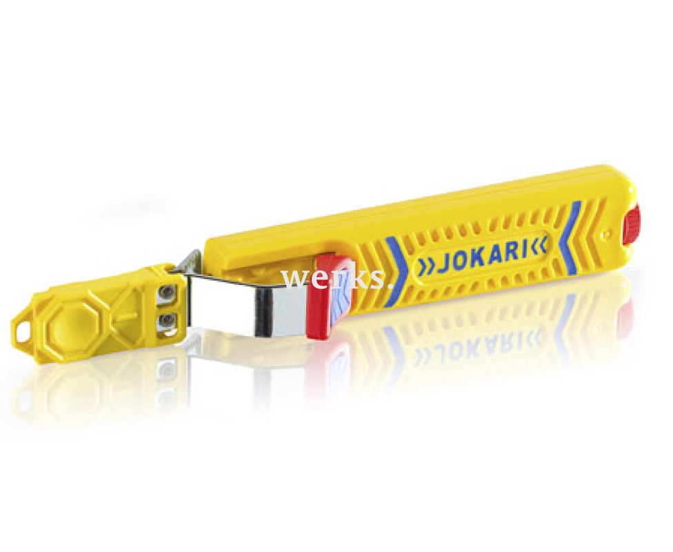 Профессиональный инструмент для снятия изоляции с практически любого круглого кабеля — нож Jokari Secura No. 28H JK 10280 длиной 170 мм. Глубина реза регулируется с помощью поворотного торцевого колёсика. Автоматическая настройка для поперечной и продольной резки. Внутри корпуса имеется отсек для лезвий. Лезвия имеют титановое покрытие, что обеспечивает их долговечность и стойкость к износу. Корпус изготовлен из полиамида.