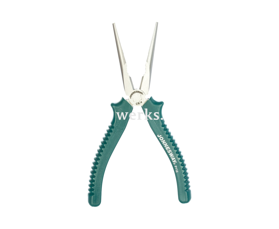 Плоскогубцы длиной 200 мм с удлиненными губками, сужающимися к концу и имеющими полукруглую форму, предназначены для работы в труднодоступных местах. Эти длинногубцы изготовлены из хромованадиевой стали и имеют матовое хромоникелевое покрытие, а также полимерные накладки на рукоятках. Губки дополнительно оснащены захватом для крупных деталей и боковыми режущими кромками. Изготовлены в соответствии со стандартом ISO 5743-88, что соответствует ГОСТу 7283-93.