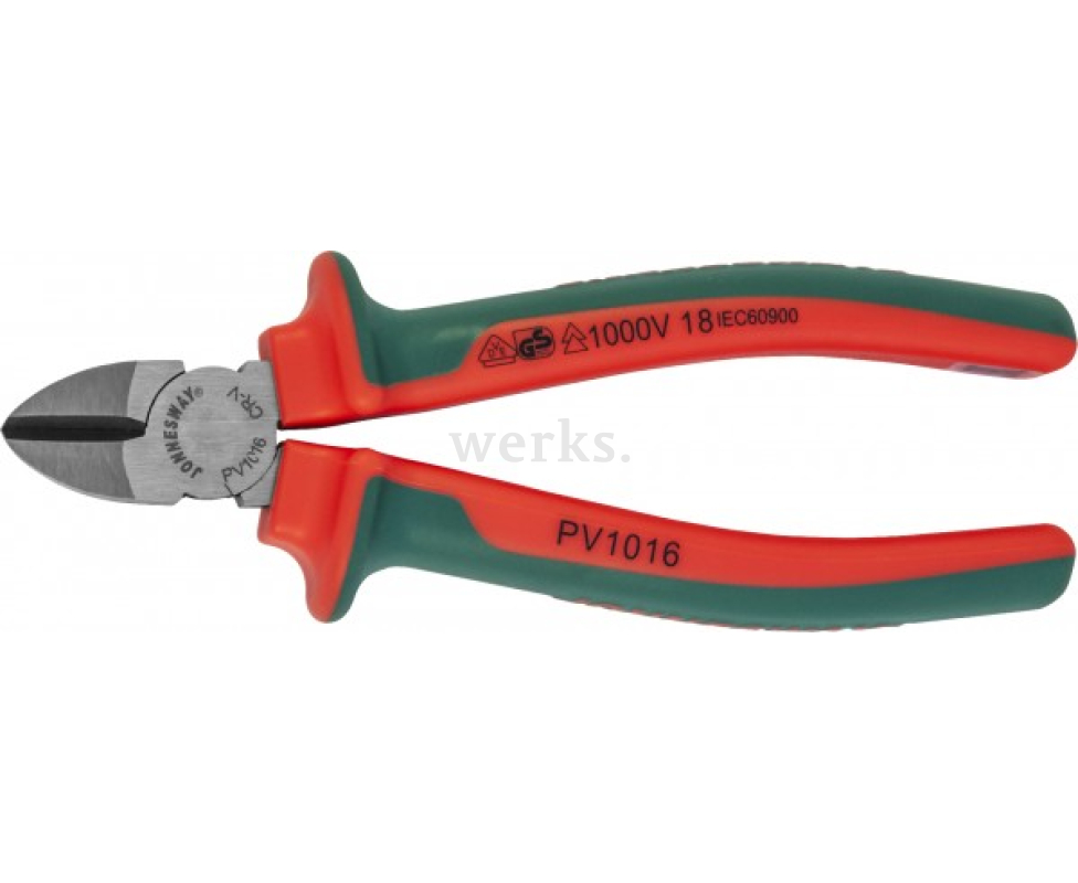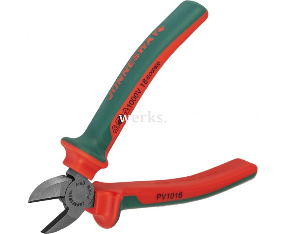 Бокорезы 'PV1016' длиной 160 мм и весом 240 г, изготовленные из хромванадиевой стали, предназначены для работы с электрооборудованием, находящимся под напряжением до 1000 В. Изолированные рукоятки гарантируют защиту пользователя от электрического удара в соответствии с требованиями стандарта VDE, соответствующего IEC 60900, и полностью соответствуют нормам ГОСТ 11516-94. Сертификат, выданный Ассоциацией электротехники, электроники и информационных технологий, позволяет наносить маркировку VDE на диэлектрический инструмент JONNESWAY. Знак VDE на рукоятке изделия символизирует высочайшие стандарты безопасности.