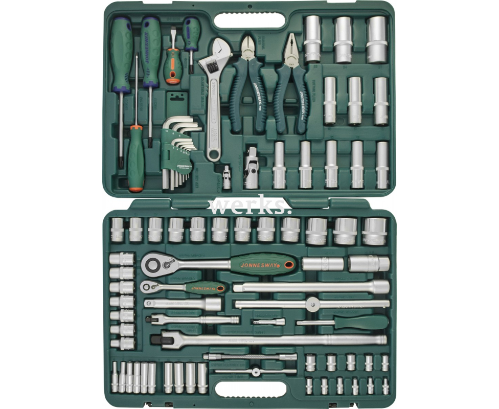 Универсальный набор предназначен для выполнения различных слесарно-монтажных работ, включая монтаж, ремонт и техническое обслуживание. СОДЕРЖАНИЕ: - Головки торцевые 1/4’’DR, 11 шт.: 4, 4.5, 5, 6, 7, 8, 9, 10, 11, 12, 13 мм; - Головки торцевые глубокие 1/4’’DR, 10 шт.: 4, 5, 6, 7, 8, 9, 10, 11, 12, 13 мм; - Головки торцевые 1/2’’DR, 19 шт.: 8, 9, 10, 11, 12, 13, 14, 15, 16, 17, 18, 19, 20, 21, 22, 24, 27, 30, 32 мм; - Головки торцевые глубокие 1/2’’DR, 11 шт.: 10, 11, 12, 13, 14, 15, 17, 19, 22, 24, 27 мм; - Карданные шарниры, 2 шт.: 1/4’’DR и 1/2’’DR; - Головки торцевые свечные, 2 шт.: 16, 21 мм; - Удлинители, 3 шт.: 1/4’’DRх50 мм, 1/2’’DRх125 мм, 250 мм; - Отверточная рукоятка 1/4’’DR; - Гибкие воротки, 2 шт.: 1/4’’DRх130 мм, 1/2’’DRх375 мм; - Т-образные воротки, 2 шт.: 1/4’’DRх130 мм, 1/2’’DRх250 мм; - Гибкий удлинитель 1/4’’DRх145 мм; - Трещоточные рукоятки, 48 зубцов, 2 шт.: 1/4’’DR и 1/2’’DR; - Угловые отвертки (шестигранные ключи), 9 шт.: 1.5, 2, 2.5, 3, 4, 5, 6, 8, 10 мм; - Отвертки, 5 шт.: (+) PH2x38, (+) PH2x100, (+) PH3x125, (-) SL 6.5x38, (-) SL 5x125 мм; - Бокорезы 6' (150 мм); - Пассатижи 6' (150 мм); - Разводной ключ 8' (200 мм); - Пластиковый кейс.
