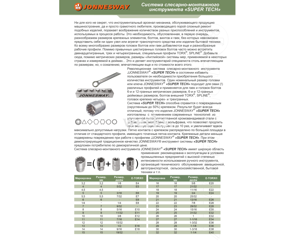 В дополнение к стандартным шестигранным головкам болтов, можно также встретить двенадцатигранные, трех- и четырехгранные, а также специальные профили TORX и SPLINE. Не забудьте о метрических размерах и размерах «Имперской» системы, используемой в некоторых странах и измеряемой в дюймах. Инновационная система слесарно-монтажного инструмента Jonnesway «Super Tech» позволяет пользователю избежать необходимости покупки множества инструментов. Один размер головки или ключа «Super Tech» подходит для семи различных профилей и может использоваться для гаек и головок болтов с 6 и 12 гранями как метрических, так и дюймовых размеров, а также для болтов с внешним TORX, SPLINE и крепежа с трех- и четырехгранными головками. Система «Super Tech» эффективно справляется с поврежденным крепежом (скругленным до 50%). Результат всегда будет на высоте, так как изделия «Super Tech» производятся с использованием современных технологий из высоколегированной хромованадиевой стали с добавлением молибдена и вольфрама, что увеличивает срок службы инструмента до 10 раз и удваивает максимально допустимые нагрузки. Площадь контакта с крепежом распределена более равномерно по сравнению со стандартным профилем, что снижает вероятность повреждения крепежных деталей при использовании инструмента Jonnesway «Super Tech». Состав: - Головки торцевые, 13 шт.: 4, 4.5, 5, 5.5, 6, 7, 8, 9, 10, 11, 12, 13, 14 мм - Рукоятка трещоточная, 135 мм - Вороток Т-образный, 130 мм - Удлинитель, 50 мм - Рукоятка отверточная 1/4' DR, 150 мм - Ключи торцевые шестигранные, 3 шт.: 1.5, 2, 2.5 мм - Переходник для бит 1/4' SDR - 1/4' HDR - Вставки-биты 1/4'' HDR, 25 мм, 20 шт: SL4, SL5.5, SL7, РН1, РН2, РН3, РZ1, РZ2, РZ3, Н3, Н4, Н5, Н6, T8, Т10, Т15, Т25, Т27, Т30, Т40 - Пластиковый кейс