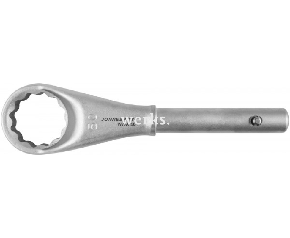 Гаечный ключ размером 50 мм, предназначенный для обслуживания высоконагруженных и сложных резьбовых соединений крупных размеров. Он состоит из двух элементов: рабочей части и полой рукоятки-воротка диаметром 24,5 мм. Длинный рычаг воротка обеспечивает передачу максимальных моментов на резьбовые соединения. Ключ выполнен из легированной хромомолибденовой стали и имеет матовое хромоникелевое покрытие.