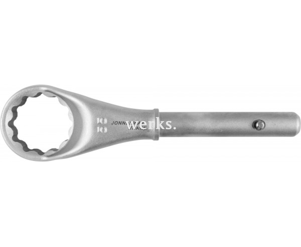 Гаечный ключ размером 55 мм, предназначенный для обслуживания высоконагруженных и сложных резьбовых соединений крупных размеров. Он состоит из двух элементов: рабочей части и полой рукоятки-воротка диаметром 24,5 мм. Длинный рычаг воротка обеспечивает передачу максимальных усилий на резьбовые соединения. Ключ выполнен из легированной хромомолибденовой стали и имеет матовое хромоникелевое покрытие.