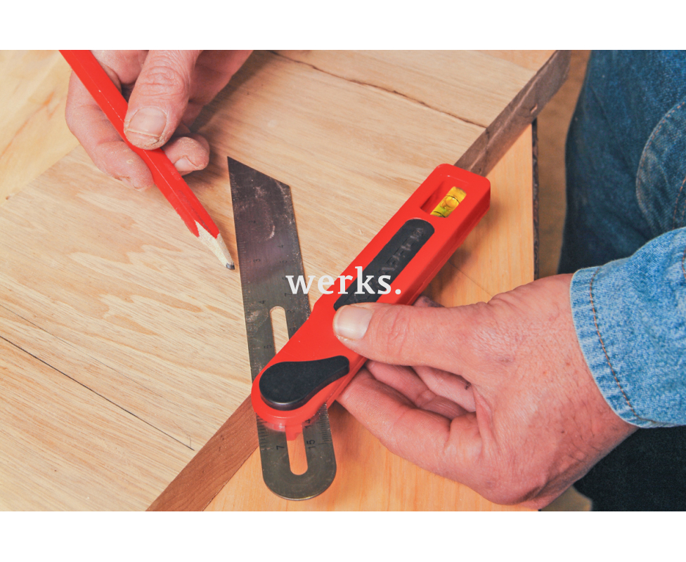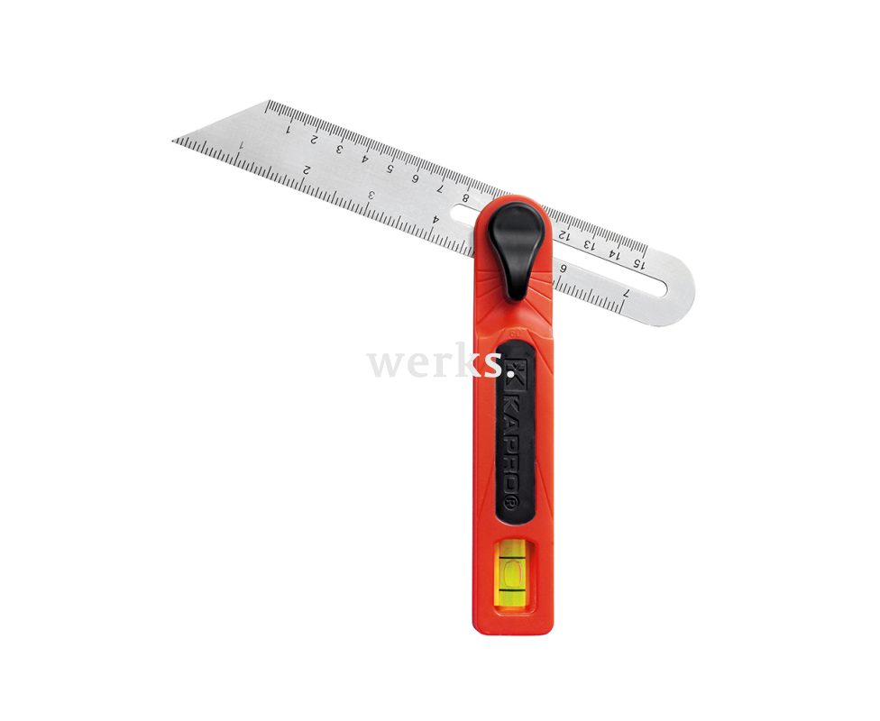 Профессиональный механический угломер с уровнем Kapro 301. У него есть угловая маркировка на ручке. Линейка изготовлена из нержавеющей стали, что обеспечивает её долговечность и защиту от коррозии.