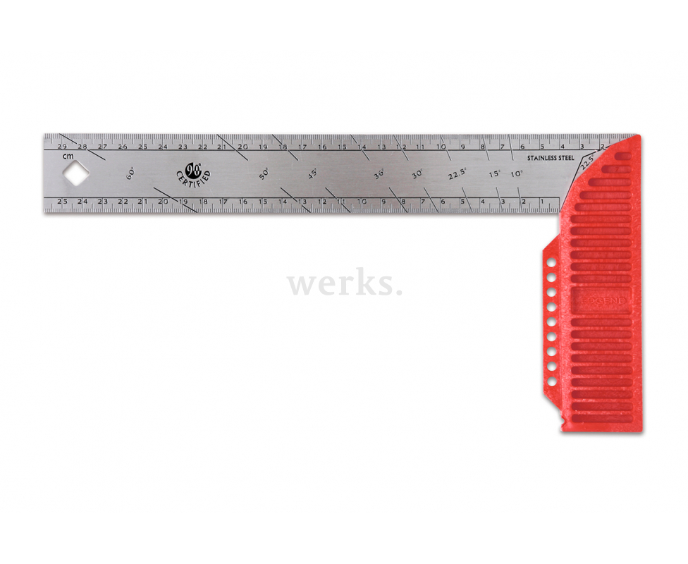 Профессиональный разметочный угольник длиной 30 см Kapro 309 Ledgend 309-30. Изготовлен из нержавеющей стали. Двусторонняя шкала. Оснащен специальными насечками с разными углами для удобства разметки. Ударопрочная ручка.