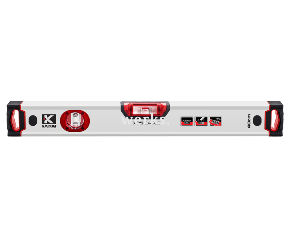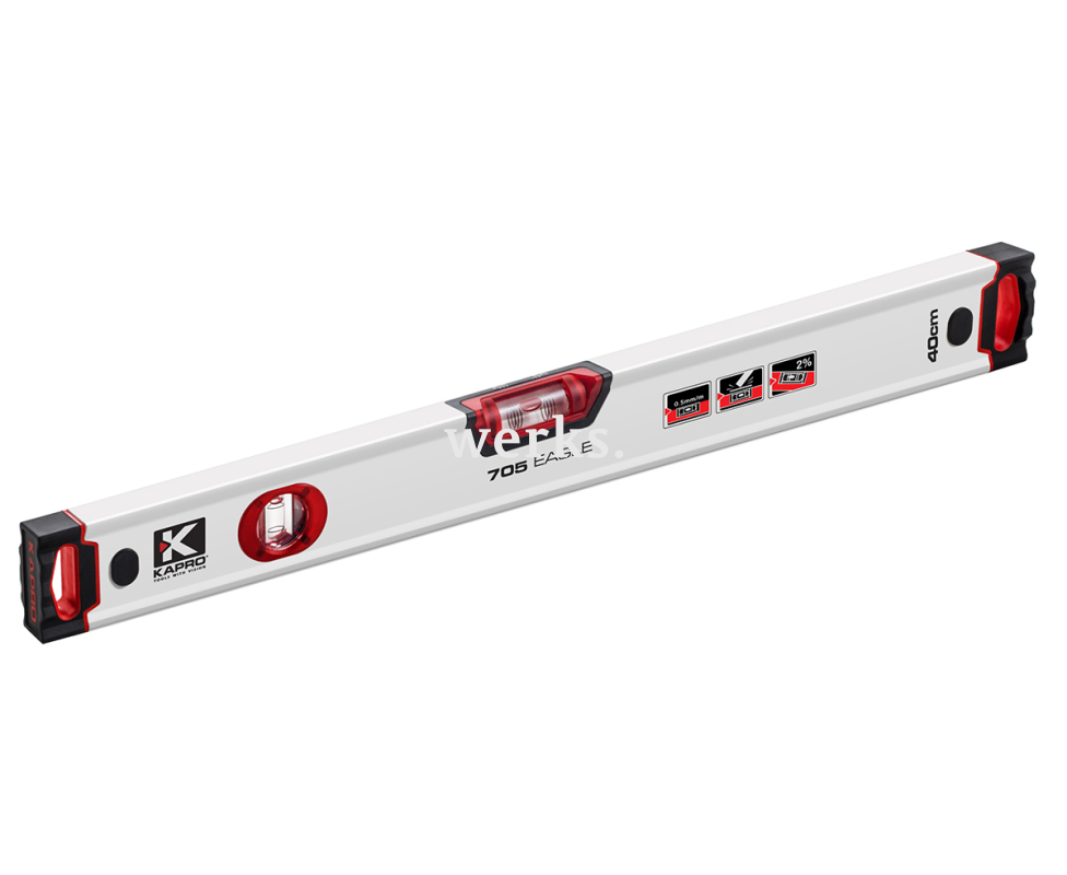 Профессиональный строительный пузырьковый уровень Kapro серии 705 Eagle 705-40-40 длиной 40 см. Устройство оборудовано двумя ударопрочными пузырьковыми капсулами, одна из которых (горизонтальная) использует технологию Optivision для повышения контрастности. Включает противоскользящие элементы, боковые амортизирующие заглушки и усиленный профиль. Максимальная погрешность измерений составляет 0,5 мм/м, а измерение отклонений достигает 2%.
