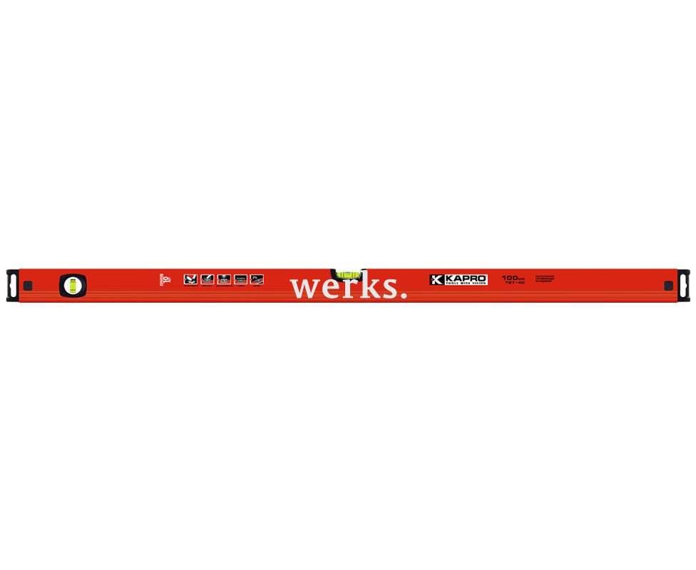 Строительный уровень Kapro 787 длиной 100 см, модель 787-40-100. Устройство имеет вертикальную и горизонтальную пузырьковую линейку с максимальной погрешностью 0,5 мм на метр. Резиновые элементы предотвращают скольжение, а боковые амортизирующие заглушки обеспечивают дополнительную защиту. Также предусмотрена возможность подвешивания.