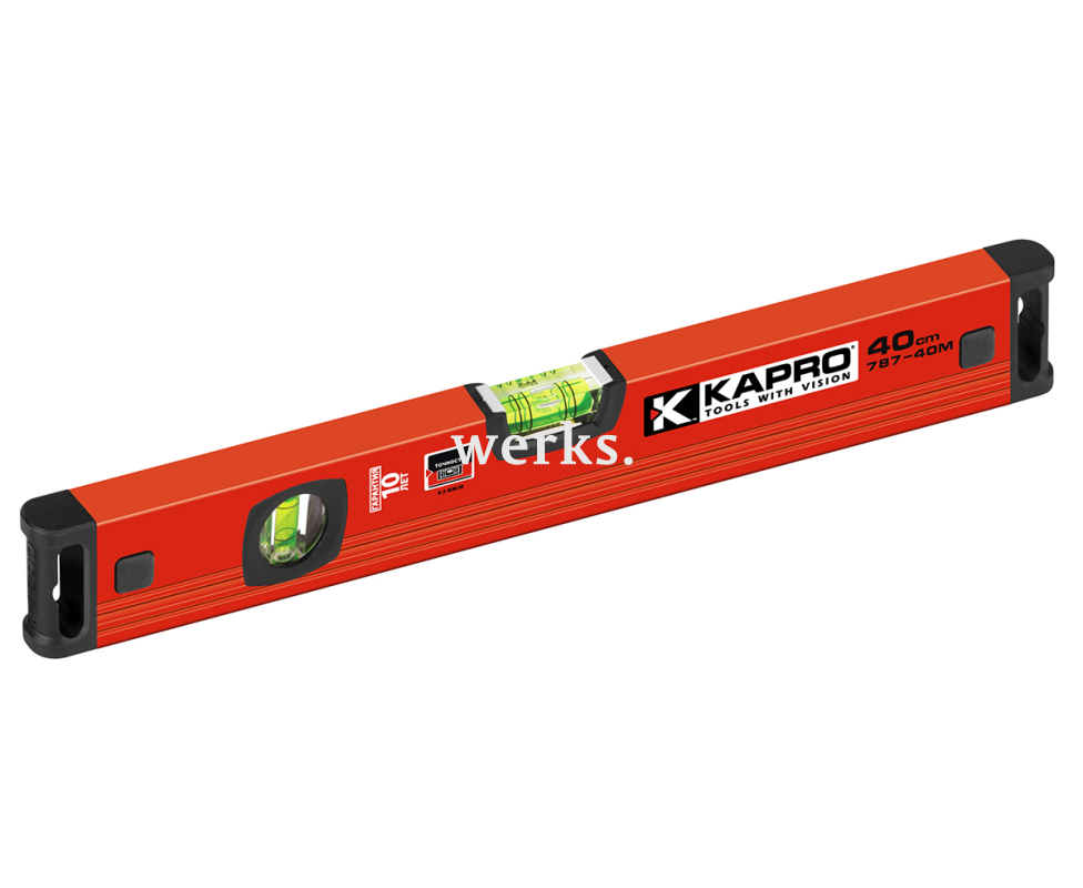 Профессиональный строительный уровень длиной 40 см с интегрированными магнитами Kapro 787M серии 787-40-40M. Оснащен специальными резиновыми выступами и боковыми заглушками для амортизации и предотвращения скольжения. Имеет вертикальные и горизонтальные пузырьковые камеры. Погрешность составляет не более 0,5 мм/м.