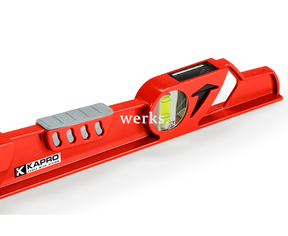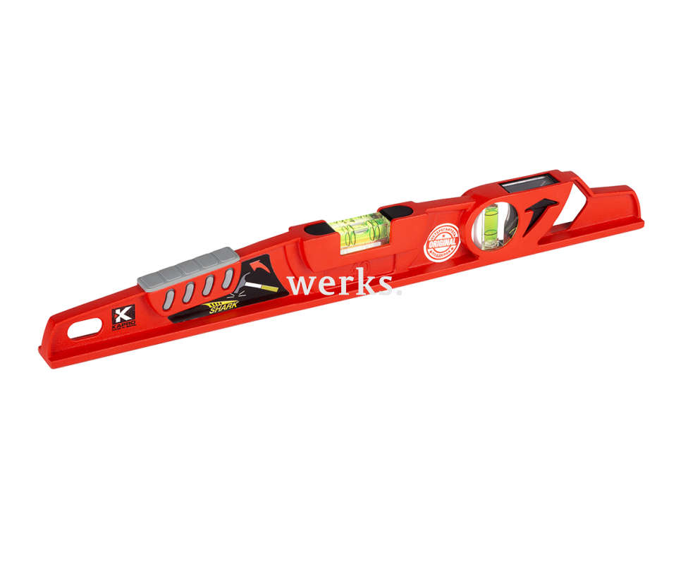 Строительный уровень Kapro 920 Shark 920-10-40 длиной 40 см. Имеет литой корпус из высокопрочного алюминия в форме трапеции и две надежные пузырьковые капсулы из полиакрила. Рабочая поверхность обработана фрезерованием, а на корпусе предусмотрена резиновая вставка. Вертикальная капсула оснащена системой двойного обзора Plumb Site Dual-View, а горизонтальная имеет дополнительные насечки для определения отклонений до 2%. Погрешность составляет 0,5 мм на метр.
