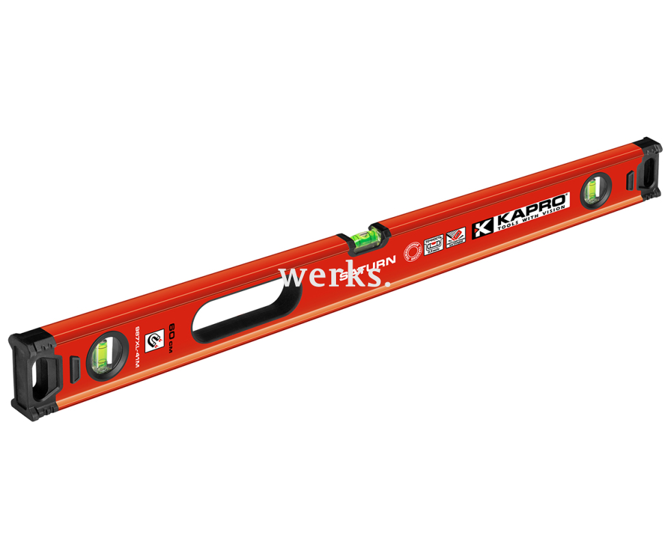 Профессиональный строительный пузырьковый уровень длиной 60 см Kapro серии 987XL Saturn 987XL-41-60M. Одна пузырьковая капсула из полиакрила расположена горизонтально, а две – вертикально. Корпус усилен увеличенными ребрами жесткости. Уровень оснащен прорезиненной рукояткой. Встроенные мощные магниты в обработанной рабочей поверхности. Боковые вставки с амортизирующими свойствами. Противоскользящие элементы корпуса и отверстия для подвешивания. Погрешность не превышает 0,5 мм на метр.