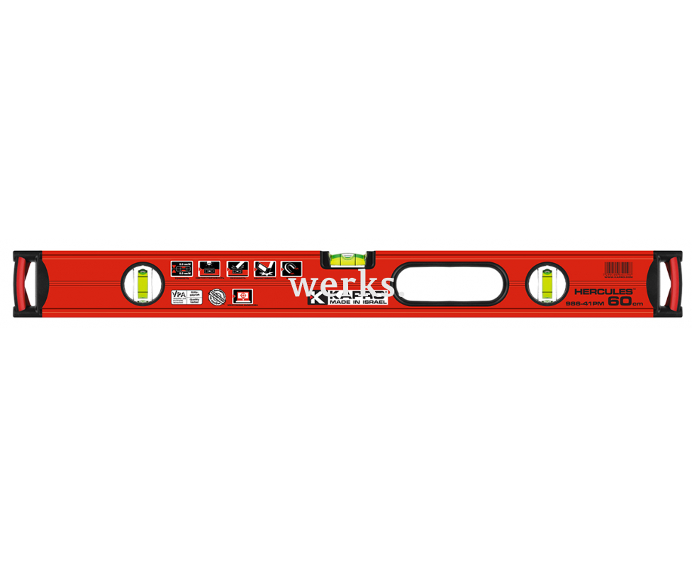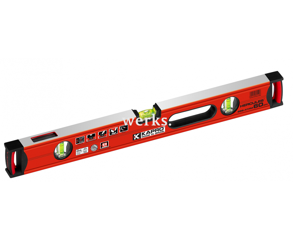 Строительный уровень длиной 60 см Kapro серии 986 Hercules 986-41-60PM оснащен тремя прочными пузырьковыми капсулами из полиакрила. Одна из двух вертикальных капсул имеет технологию двойного обзора Plumb Site Dual-View. Горизонтальная капсула выполнена в сферической форме и увеличенном размере. Уровень оборудован мощными магнитами из редкоземельных металлов и двумя фрезерованными рабочими поверхностями. Боковые амортизирующие вставки обеспечивают дополнительную защиту. Эргономичная рукоятка с прорезиненным покрытием обеспечивает комфорт в использовании. Погрешность составляет 0,5 мм/м, включая перевернутое положение.