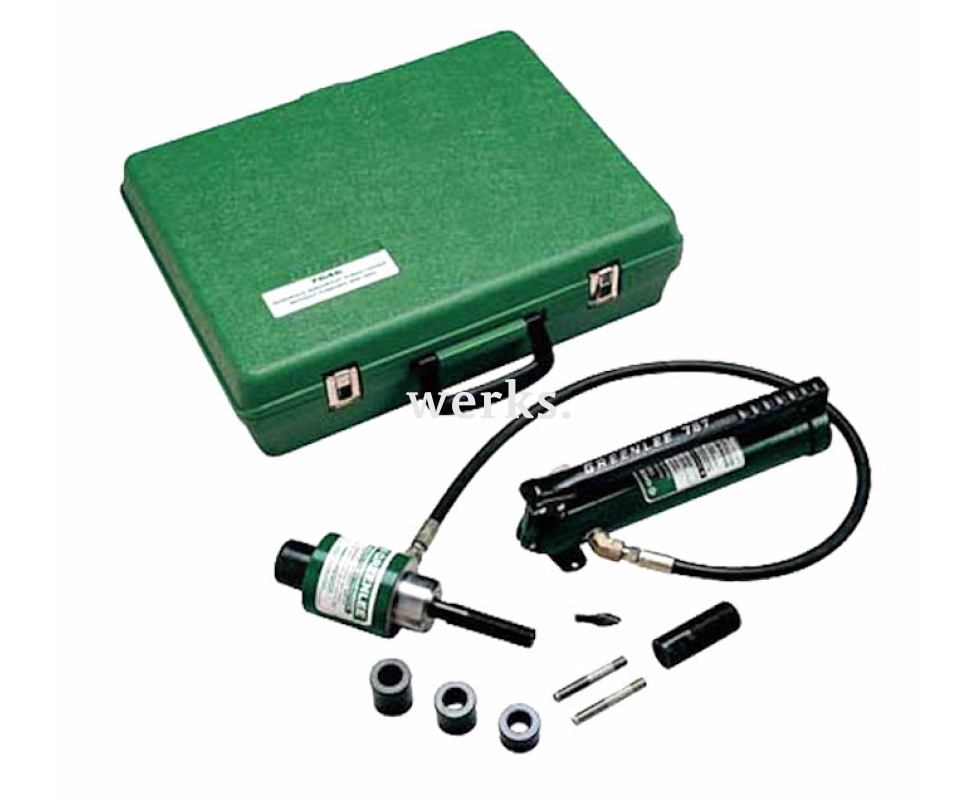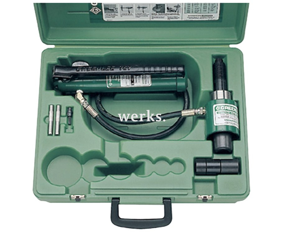 Ручной гидравлический инструмент для создания круглых отверстий диаметром до 143,7 мм и квадратных отверстий размером 138х138 мм в стали толщиной до 3,5 мм. Максимальное усилие выдавливания составляет 110 кН. В комплект входят: гидроцилиндр, ручной гидравлический насос, гидравлический шланг длиной 0,9 м, переходный стяжной болт с размерами 9,5 на 19 мм, короткая, средняя и длинная прокладочные втулки, ступенчатое сверло диаметром 12,7 мм, а также дышло для гидравлического привода с размерами 19,0 x 137 мм. Упакован в прочный пластиковый кейс. KLK50159062