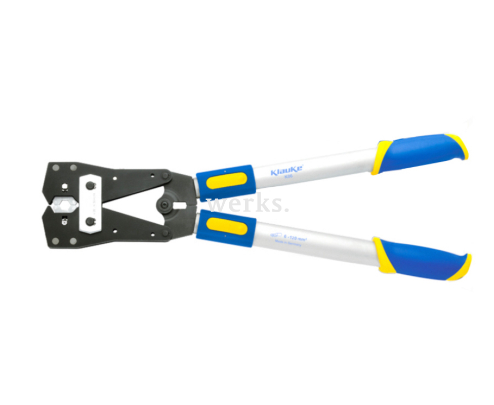 Для опрессовки облегченных медных кабельных наконечников и соединителей стандартов ТМЛ и Klauke в диапазоне от 6 до 120 мм². Синхронная настройка обеих вращающихся матриц в необходимое положение осуществляется одним движением. Установочное колесо и ячейки на матрицах имеют маркировку, указывающую размер сечения наконечника. Профиль опрессовки выполнен в форме шестигранника. Телескопические рукоятки, которые можно раздвигать, имеют несколько фиксируемых позиций. KLKK06