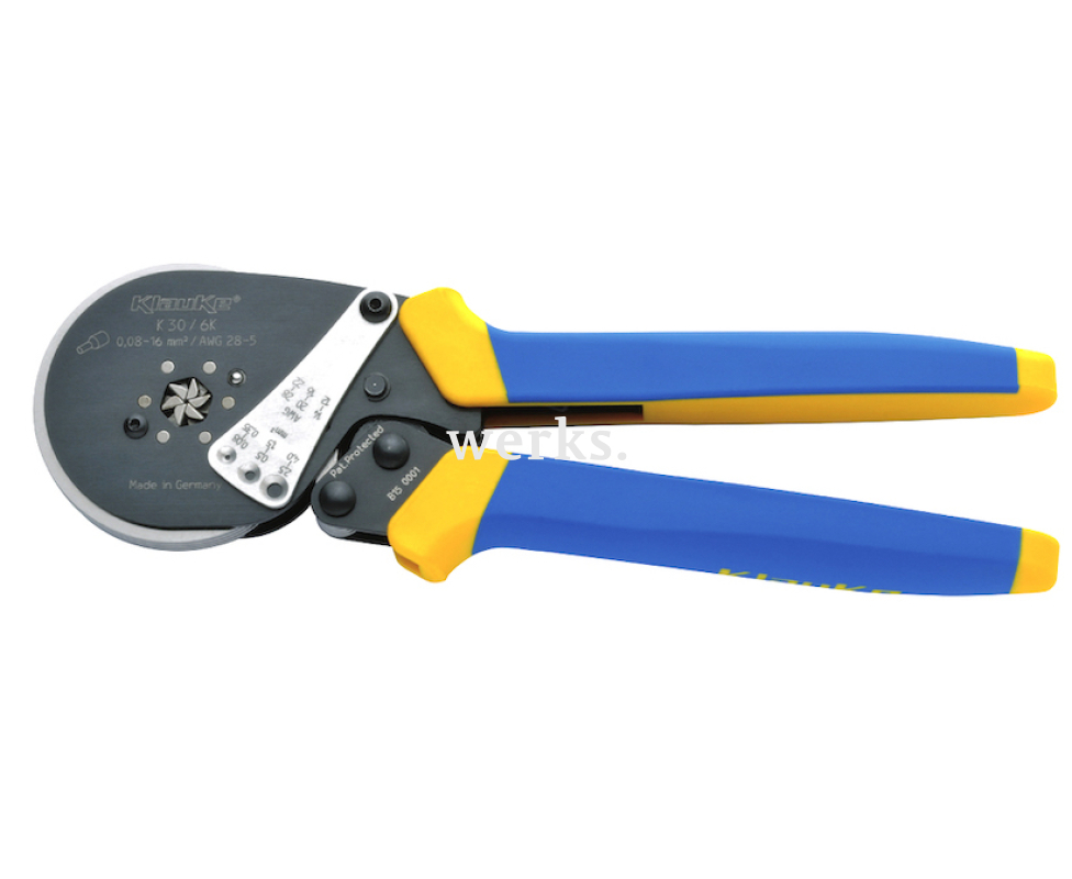 Для обжима изолированных и неизолированных втулочных наконечников в диапазоне от 0,08 до 16 мм², а также двойных втулочных наконечников 2 х 0,5 - 2 х 6 мм². Профиль обжима имеет форму шестигранника. Наконечник подается сбоку. Устройство оснащено храповым механизмом и автоматической настройкой обжима. Калибровочная поворотная пластина гарантирует точное позиционирование наконечников с малыми сечениями. Открытие осуществляется простым нажатием на рычаг. KLKK306K