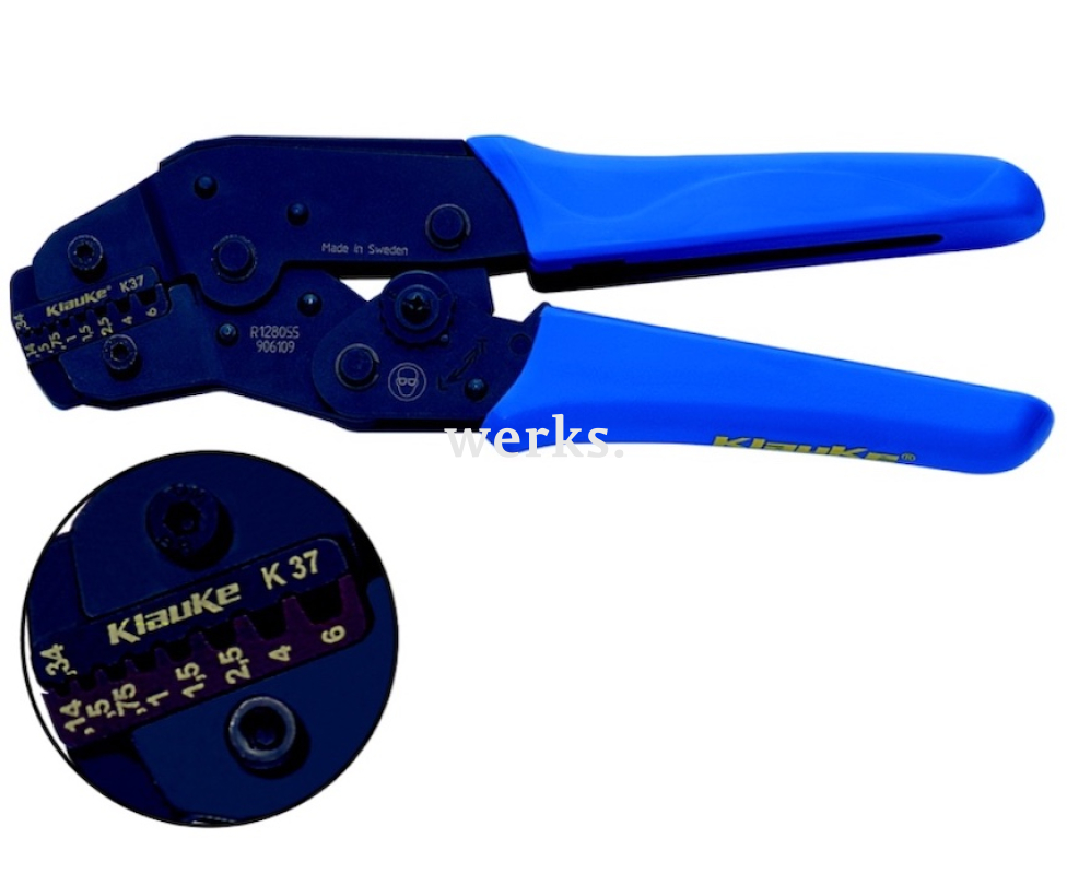 Для обжима изолированных и незащищенных втулочных наконечников в диапазоне 0,14 - 6 мм². Форма обжима - трапециевидная. Оснащен храповым механизмом. Боковая подача наконечника. Имеется отдельная ячейка для обжима каждого размера с обозначением сечения жилы. KLKK37