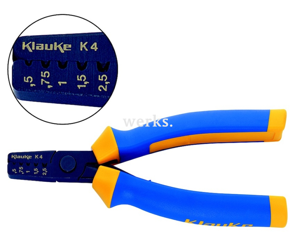 Для обжима изолированных и незащищенных втулочных наконечников в диапазоне от 0,5 до 2,5 мм². Метод обжима - вдавливание. Боковая подача наконечника. Встроенный резак для кабеля. Отдельная ячейка для обжима каждого размера сечения с указанием размера жилы. Удобное открытие губок благодаря встроенным в рукоятки плоским стальным пружинам. KLKK4