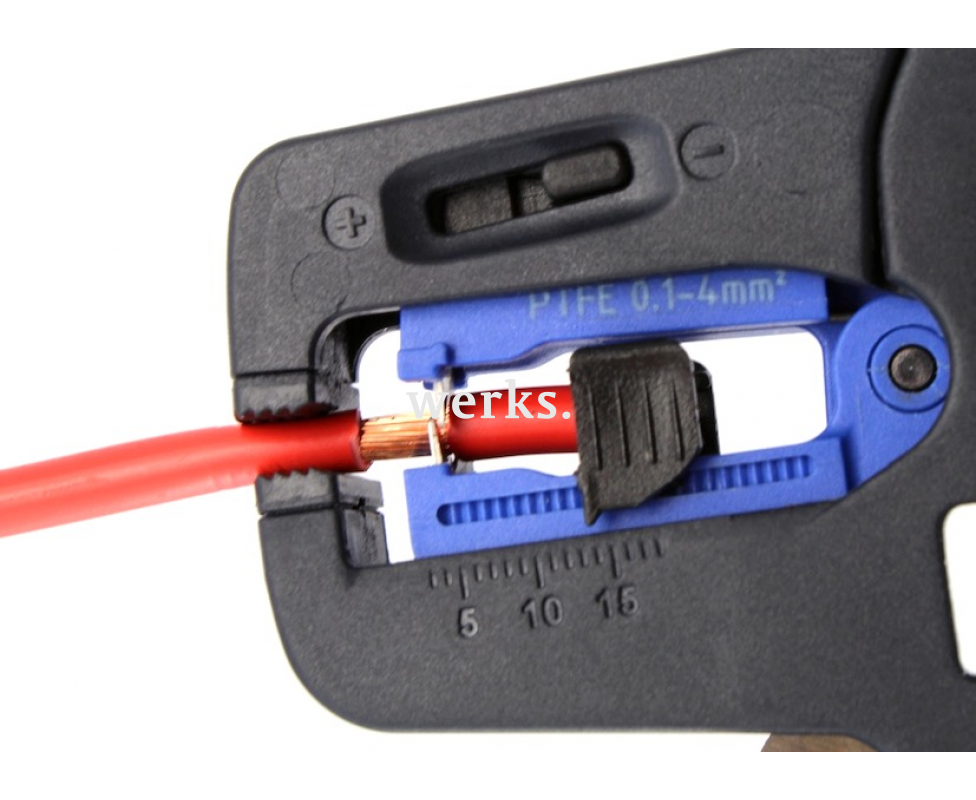 Инструмент для обрезки и удаления изоляции с монтажных проводов в жесткой изоляции (PTFE, Teflon, Фторопласт-4) с автоматической настройкой под размер сечения проводника. Оснащен лезвиями с V-образным профилем. Подходит для проводников и жил с поперечным сечением от 0,08 до 4 мм². Имеет фиксируемый ограничитель длины снимаемой изоляции с интегрированной шкалой. Регулируемая длина снятия изоляции составляет от 3 до 17 мм. Встроенный резак для кабеля. Корпус выполнен из легкого ударопрочного поликарбоната. В комплект входит сменная матрица с лезвиями V-профиля K432E2. KLKK432V