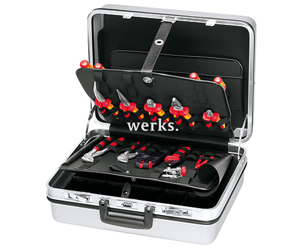 Набор инструментов для электриков Knipex KN-002130 включает 23 предмета и поставляется в практичном чемодане, который обеспечивает удобство хранения и транспортировки.