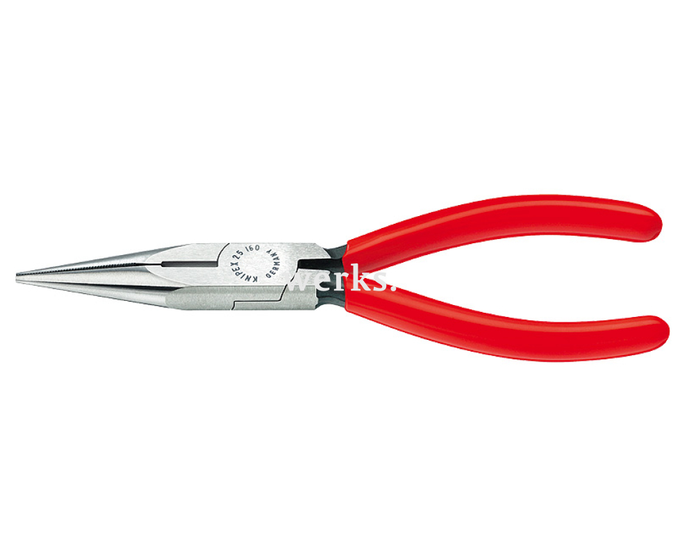 Плоские круглогубцы Knipex KN-2501160, длиной 160 мм, предназначенные для профессионального использования, оснащены режущими кромками и имеют захватные поверхности с насечками.