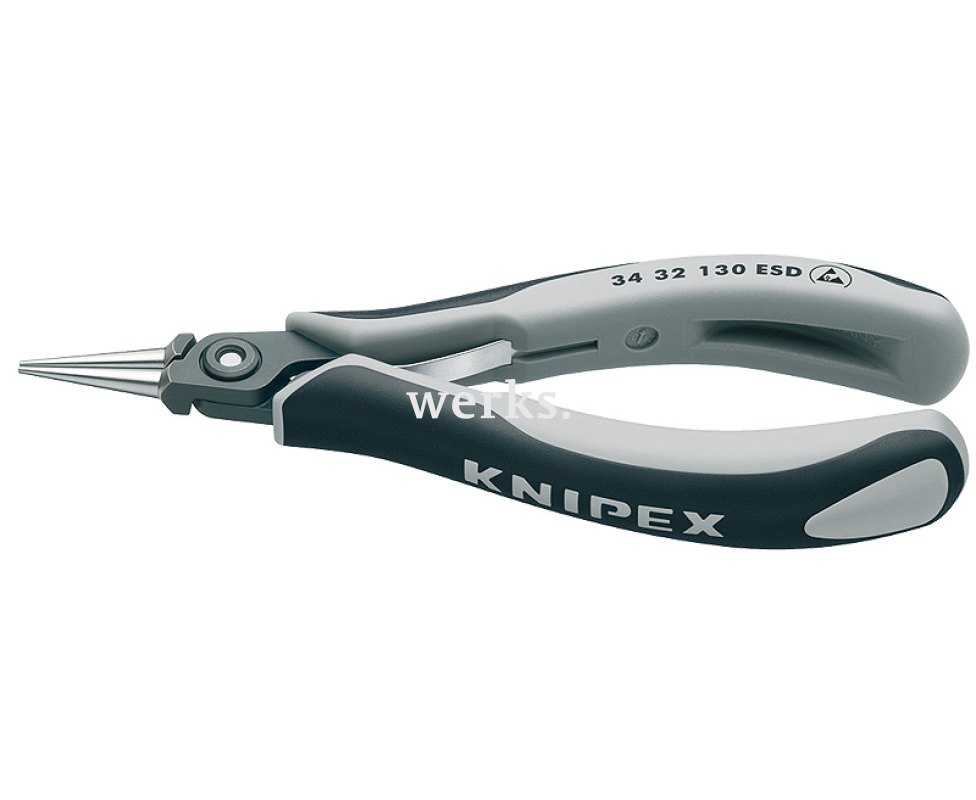 Компактные прецизионные захватные плоскогубцы для электроники с антистатическими свойствами Knipex KN-3432130ESD длиной 135 мм, выполнены из кованой хромванадиевой стали с шарикоподшипниками и имеют полированную вороненую головку.