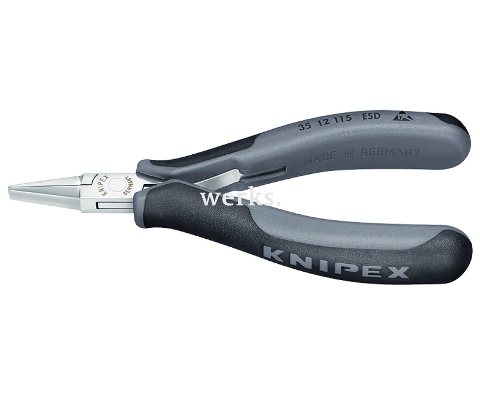 Антистатические захватные плоскогубцы Knipex KN-3512115ESD для работы с электроникой имеют длину 115 мм. Их ручки выполнены из многокомпонентного материала с двухцветным покрытием, что гарантирует эффективное рассеивание и полное устранение статического электричества.