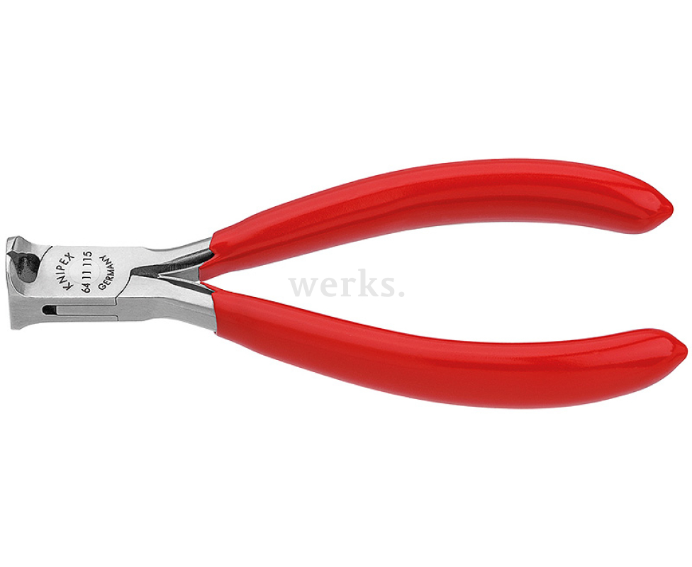 Эргономичные и функциональные торцевые кусачки для электроники Knipex KN-6411115 длиной 115 мм, высокоточный инструмент, предназначенный для аккуратного резания в области электроники и точной механики.