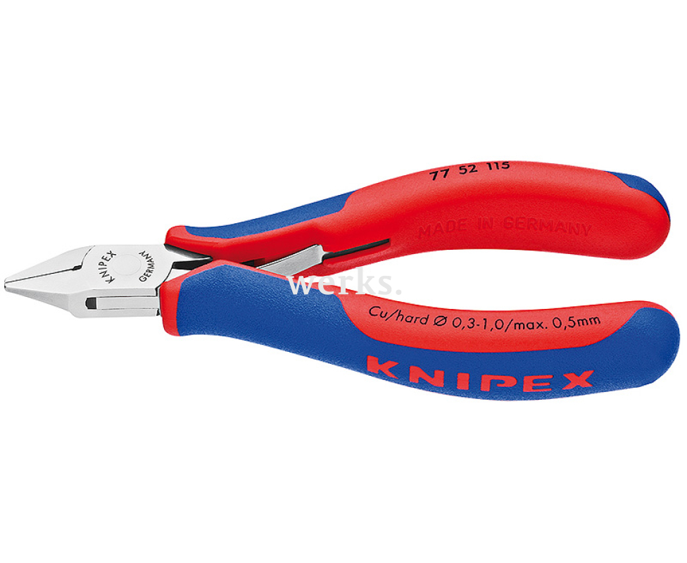 Боковые кусачки Knipex KN-7752115 для электроники длиной 115 мм обладают прецизионно отшлифованными режущими кромками, которые дополнительно подверглись индукционной закалке с использованием высокочастотных токов, достигая твердости HRC 62.