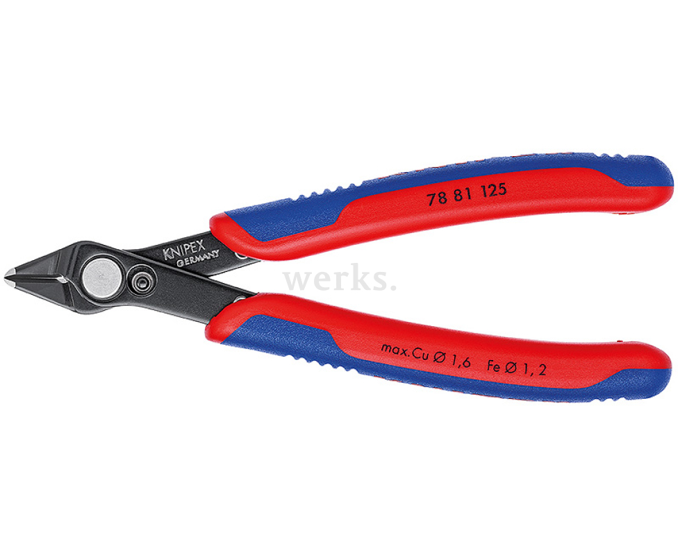 Профессиональные ножницы Electronic Super Knips Knipex KN-7881125 длиной 125 мм, оснащенные пружиной для автоматического открытия и ограничителем раскрытия.