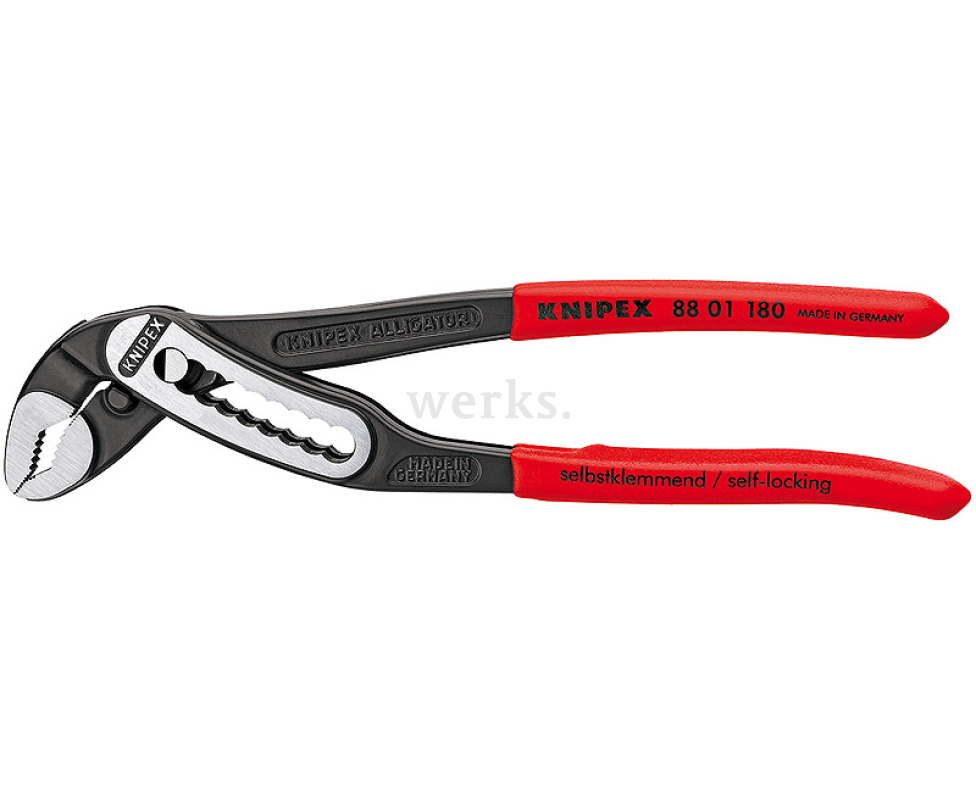 Качественные клещи KNIPEX Alligator KN-8801180 длиной 180 мм, оснащенные захватными губками с уникально закаленными зубцами твердостью HRC 61.