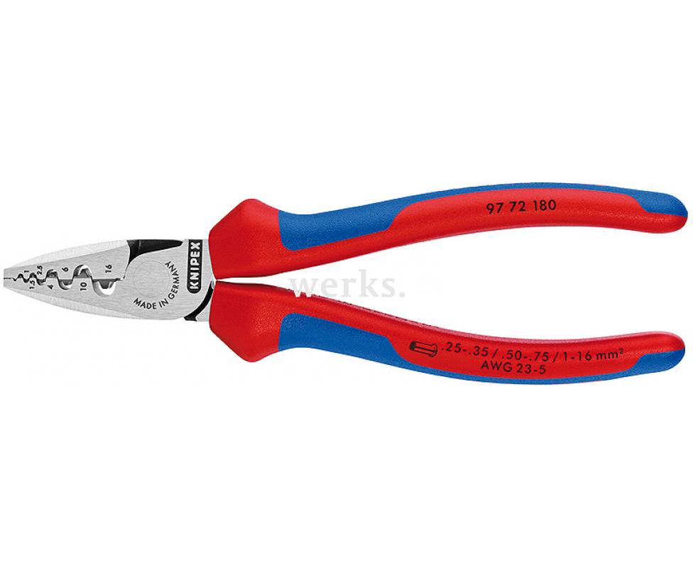 Инструмент для обжима контактных гильз Knipex KN-9772180 длиной 180 мм отличается высокой прочностью соединений при минимальных усилиях, обеспечивает точный обжим и надежность в использовании.