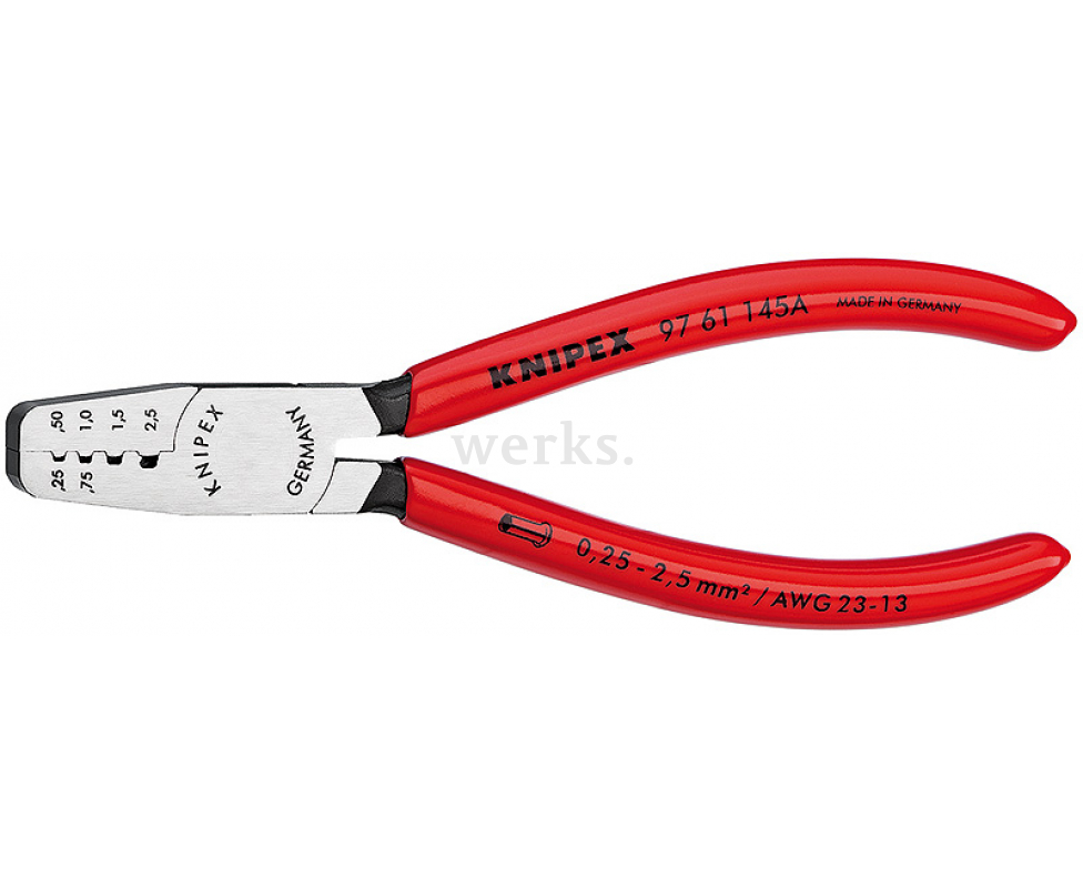 Качественный и практичный инструмент для обжима контактных гильз Knipex KN-9761145A длиной 145 мм, предназначенный для тех, кто ценит надежность, высокое качество и комфорт в работе.