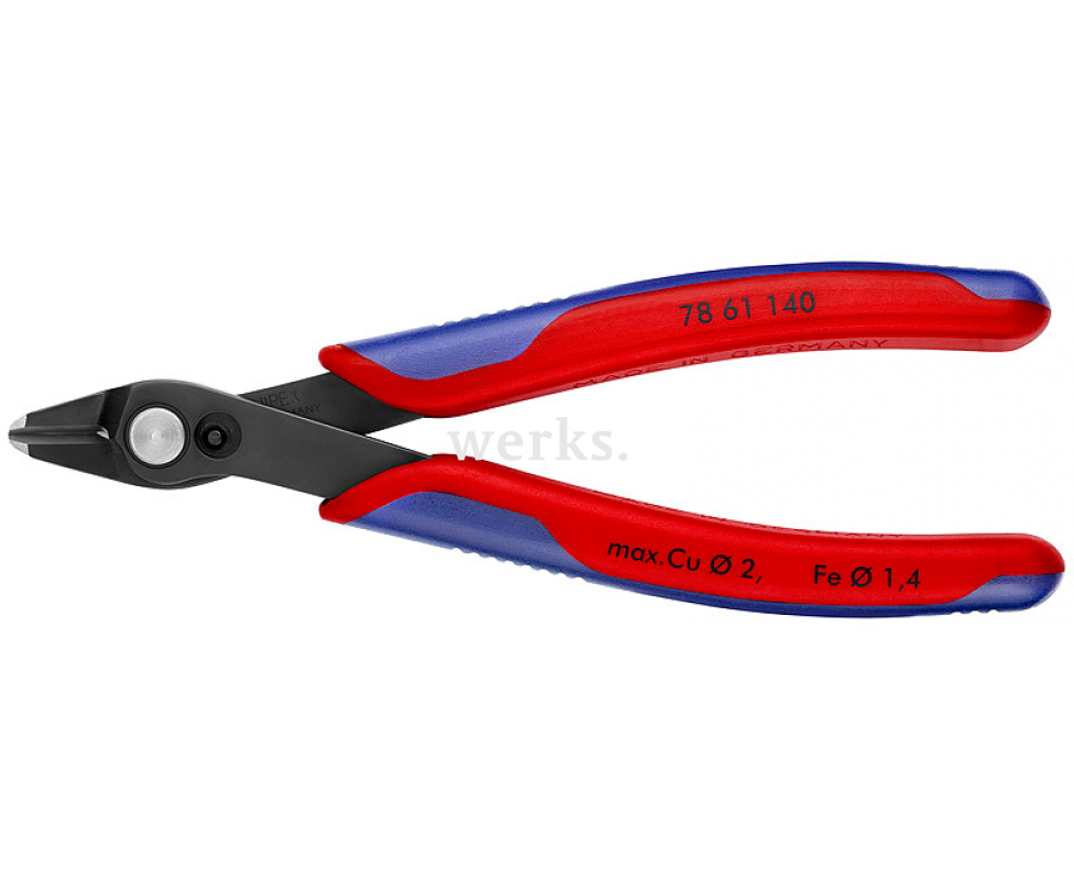 Прецизионные кусачки Electronic Super Knips XL Knipex KN-7861140SB длиной 140 мм обладают индукционно закаленными режущими кромками без фаски с твердостью HRC 54, что гарантирует аккуратный и ровный срез.