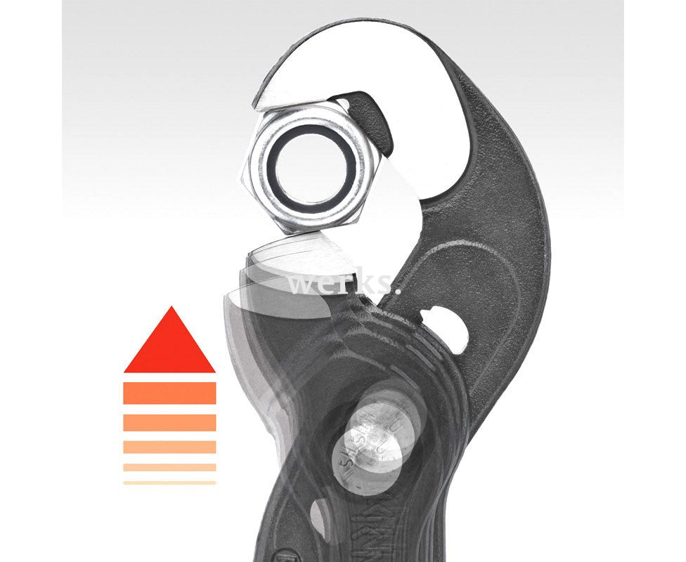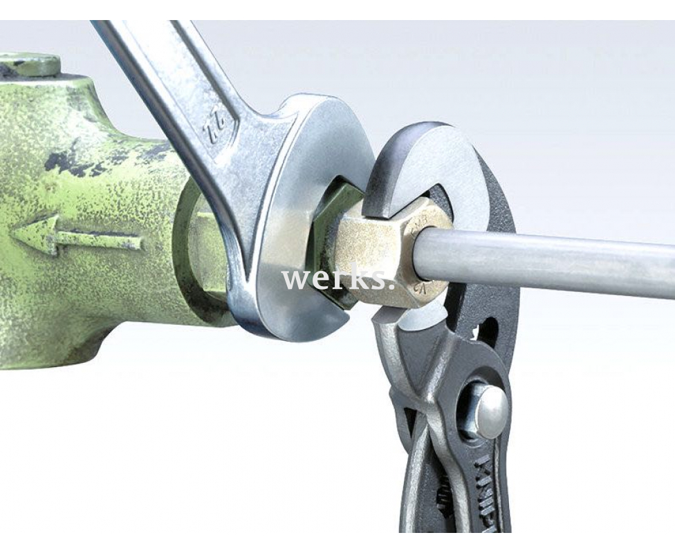 Клещи Knipex RAPTOR длиной 250 мм имеют серое покрытие и полированную головку. Они изготовлены из кованой, закаленной в масле хромованадиевой стали. Инструмент подходит для работы с гайками и винтами, заменяя набор гаечных ключей размером от 10 до 32 мм (3/8 - 1 1/4 дюйма). Губки имеют 15-позиционную установку. Захватные губки с закаленными зубцами обеспечивают надежное сцепление. Самофиксация на деталях от 17 мм исключает люфт и предотвращает соскальзывание, при этом головки винтов не скругляются. Две направляющие коробчатого шарнира обеспечивают дополнительную стабильность. Инструмент надежно захватывает скругленные, заржавевшие или окрашенные гайки и винты, что делает его идеальным для ремонта тормозной системы автомобиля. Специальный механизм защищает от случайного защемления пальцев. Быстрое закрепление винтовых соединений осуществляется по принципу трещоточного ключа. Надежная фиксация винта шарнира предотвращает случайную перестановку. Упакованы в блистер.