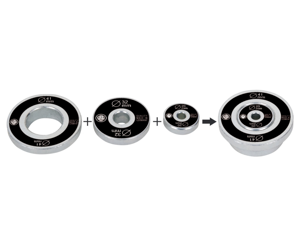 Комплект упоров используется для поддержки шпинделя на полом валу. Комплект содержит три упора разных диаметров, которые можно комбинировать друг с другом. Благодаря ступенчатому силуэту упоры идеально сидят на полом валу. В зависимости от размера, различные упоры можно вкладывать друг в друга для достижения точного диаметра вала. Вариант поддержки для шпинделя с полым валом
