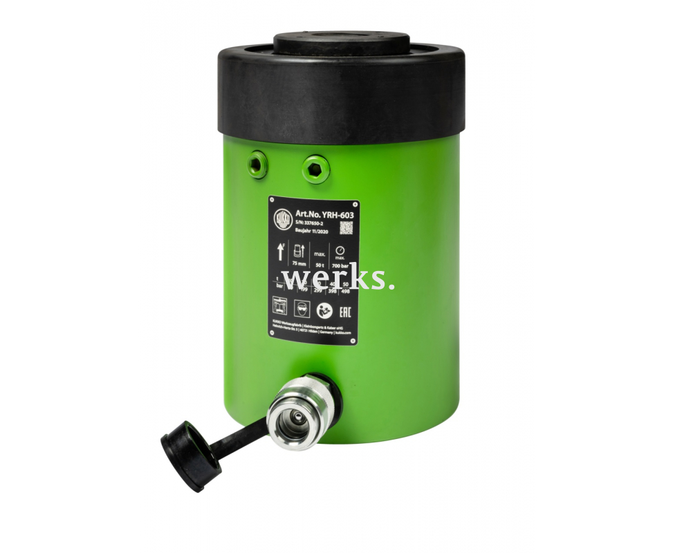 Гидравлические цилиндры с полым поршнем серии YRH используются в составе гидравлической программы KUKKO в ремесленном производстве, промышленности и мастерских. Они могут использоваться как в качестве напорных, так и в качестве натяжных цилиндров, обеспечивая экономию усилий и универсальность работы даже в сложных условиях тяги или при необходимости приложения большого усилия. Все модели оснащены соединительной муфтой CR-400 с пылезащитным колпачком. Наружная резьба на головке цилиндра, внутренняя резьба на штоке и монтажная резьба на основании цилиндра обеспечивают лёгкость сборки.