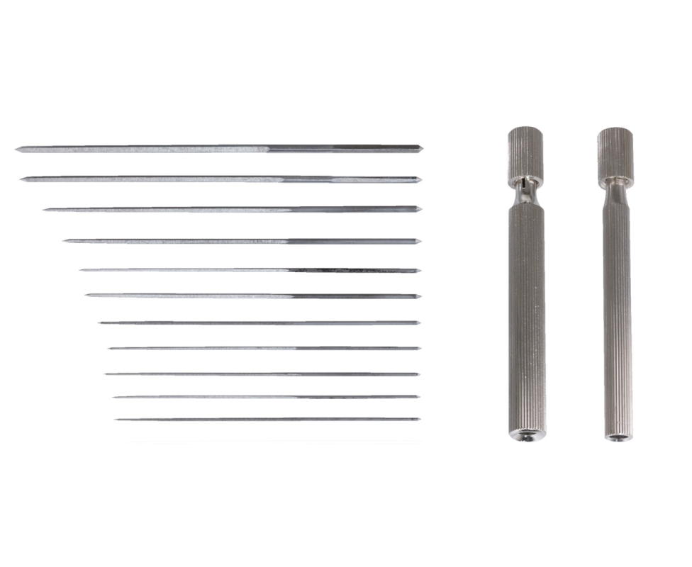 Набор из 12 разверток для чистки сопел. Набор состоит из двух держателей и одиннадцати разверток диаметром от 0,6 до 1,9 мм. Компактный и удобный набор, подходящий для сопел всех размеров.