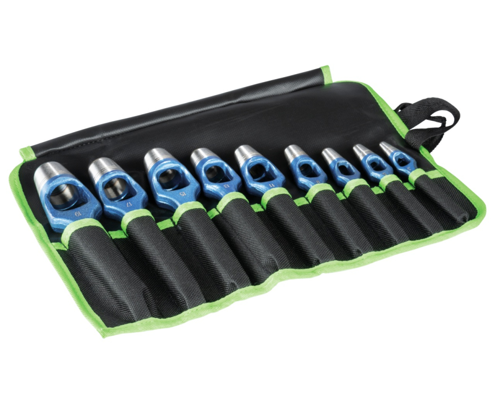 Набор из 9 пробойников для ручек разного диаметра используется для пробивки отверстий или изготовления уплотнителей и уплотнительных колец из резины, кожи, войлока, пластика, пробки и различных тканей. Короткий полый цилиндр остро срезан по нижнему краю. Коническая головка пробойника прикреплена к двум держателям, что создает двухстороннюю выемку. Благодаря особо прочной конструкции пробойников для ручек можно обрабатывать широкий спектр материалов. Практичная пластиковая сумка-свертыватель обеспечивает максимальную организацию и идеально подходит для транспортировки. Особо острые лезвия для индивидуальной обработки различных материалов. Равномерное распределение силы удара по полому цилиндру поршня.