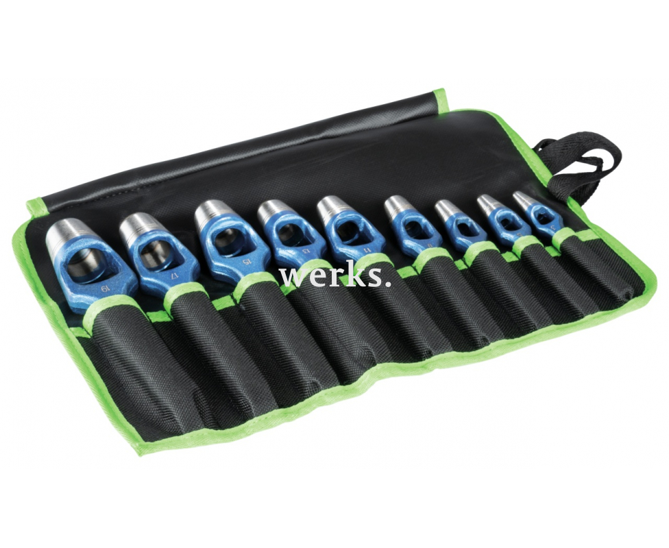 Набор из 9 пробойников для ручек разного диаметра используется для пробивки отверстий или изготовления уплотнителей и уплотнительных колец из резины, кожи, войлока, пластика, пробки и различных тканей. Короткий полый цилиндр остро срезан по нижнему краю. Коническая головка пробойника прикреплена к двум держателям, что создает двухстороннюю выемку. Благодаря особо прочной конструкции пробойников для ручек можно обрабатывать широкий спектр материалов. Практичная пластиковая сумка-свертыватель обеспечивает максимальную организацию и идеально подходит для транспортировки. Особо острые лезвия для индивидуальной обработки различных материалов. Равномерное распределение силы удара по полому цилиндру поршня.
