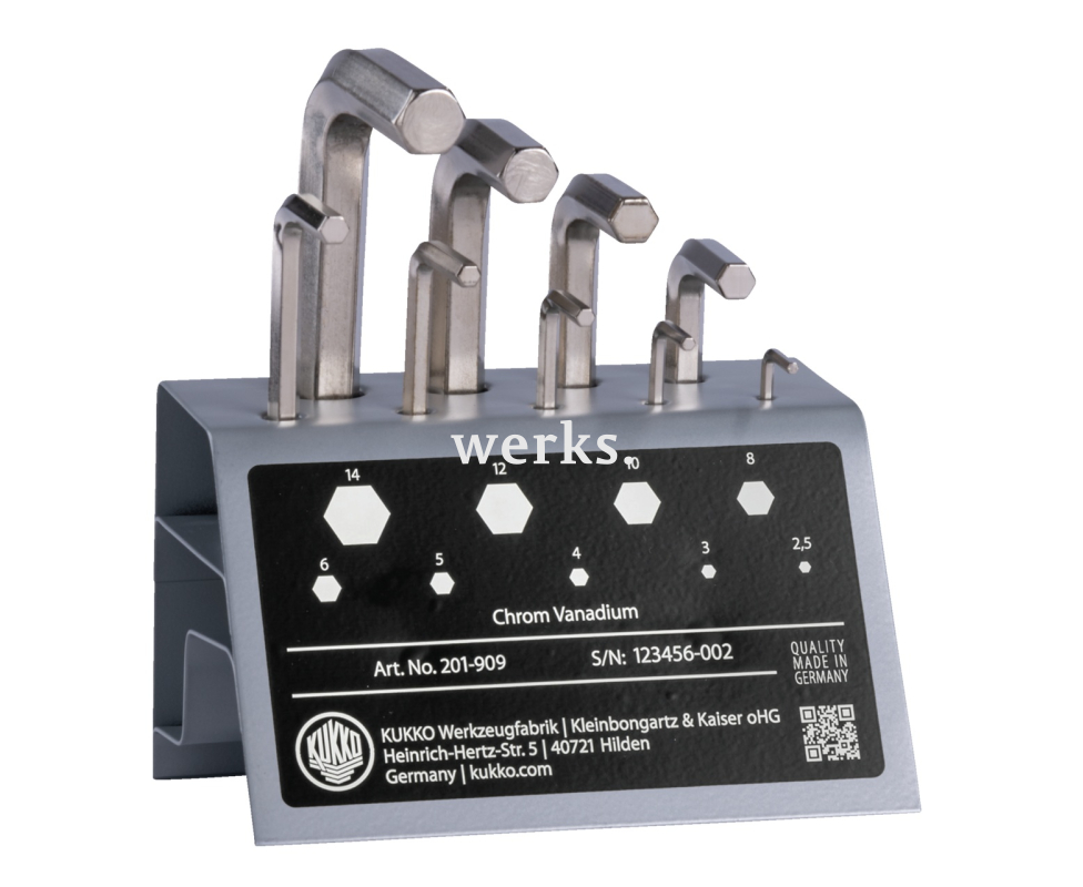 Стойки для торговли и мастерских серии 201/202, соответствующие стандарту ISO 2936, используются для упорядоченного хранения шестигранных ключей в мастерских, на производстве и в ремесленных мастерских. Твёрдость и крутящий момент соответствуют стандарту ISO. Серия 201/202 недорогая и компактная, доступна в различных размерах, подходящих для различных шестигранников. Передние кромки аккуратно скошены. Различные варианты исполнения позволяют использовать ключи с шестигранниками разных размеров.