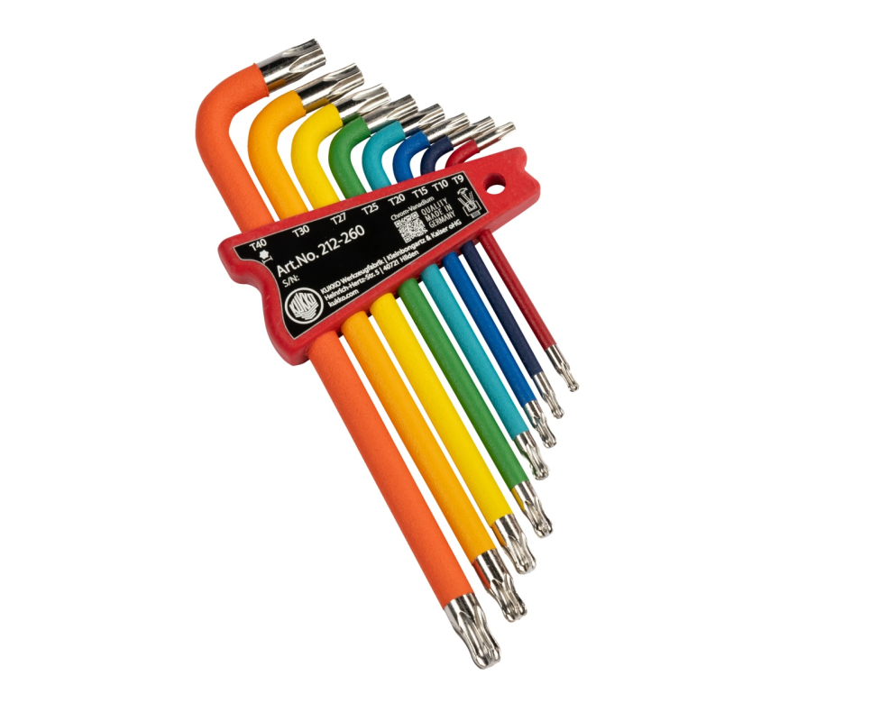 Шестигранные ключи серии 212BT с цветовой кодировкой и шаровой головкой используются для работы с труднодоступными головками винтов в мастерских, на производстве и в сфере торговли. В отличие от шестигранных ключей, профиль Torx располагается в центре, что облегчает работу и снижает износ. Цветовая кодировка шестигранных ключей облегчает выбор нужного размера. Цветовая кодировка шестигранных ключей упрощает выбор. Различные конструкции позволяют использовать их с различными размерами шестигранников.