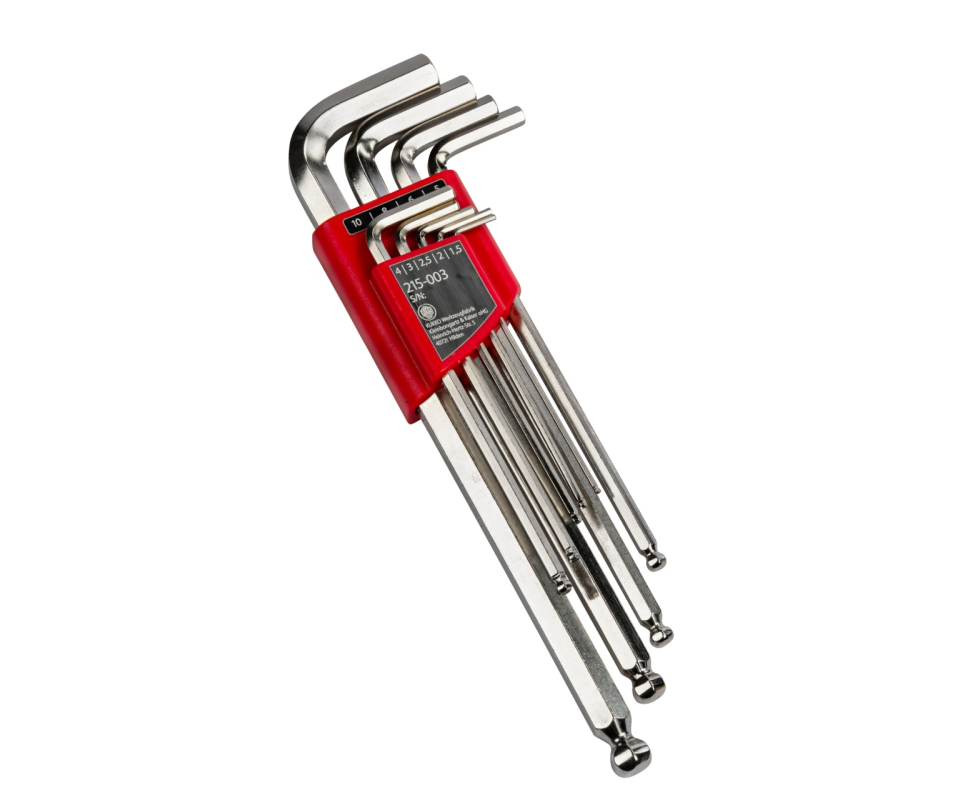 Длинные шестигранные ключи с шаровой головкой в зажиме KUKKO в упаковке SB серии 215 используются для работы с труднодоступными головками винтов в мастерских, на производстве и в ремесленных мастерских. Твёрдость и крутящий момент соответствуют стандарту ISO. Серия 215 отличается доступной ценой и компактностью, поставляется в запираемом ударопрочном пластиковом корпусе. Шаровая головка обеспечивает беспрепятственное завинчивание под углом до 30°. Аккуратно скошенные торцевые поверхности.