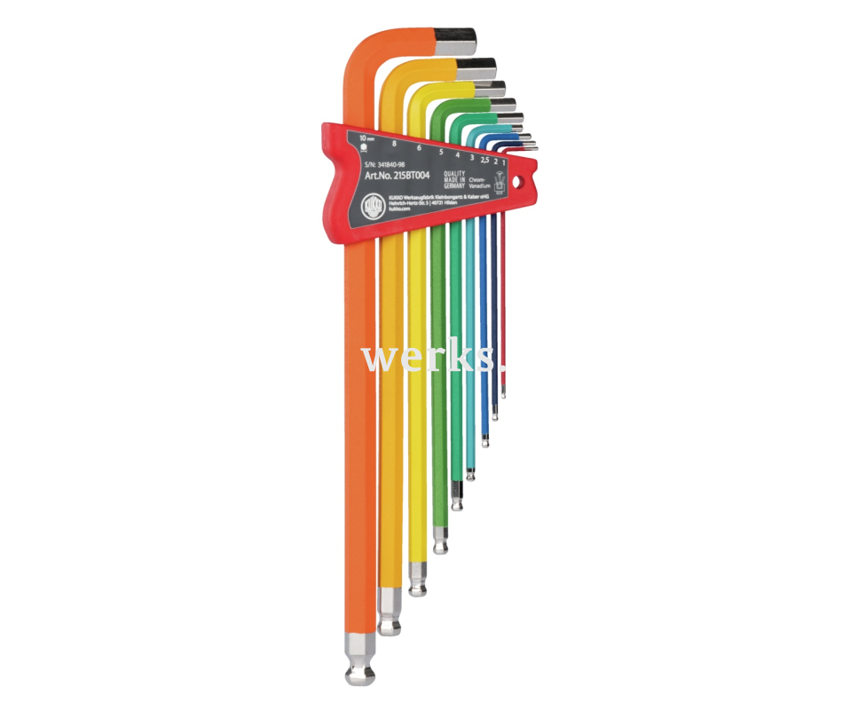 Длинные шестигранные ключи с шаровой головкой в блистерной упаковке KUKKO-Clip серии 215BT используются для работы с труднодоступными головками винтов в мастерских, на производстве и в торговле. Твёрдость и крутящий момент соответствуют стандарту ISO. Цветовая кодировка шестигранных ключей облегчает выбор нужного размера. Шаровая головка обеспечивает беспрепятственное завинчивание под углом до 30°. Цветовая кодировка шестигранного ключа упрощает выбор.