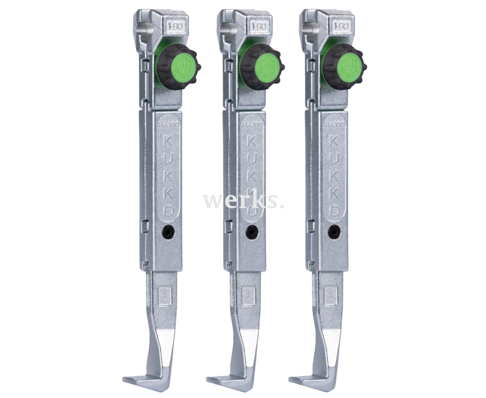 Комплект из трёх быстрорегулируемых стандартных захватов подходит для универсальных трёхлапковых съёмников. Прочные захваты гарантируют особенно безопасный демонтаж подшипников, шестерён и дисков. Зелёные рифлёные ручки обеспечивают максимальный комфорт и позволяют быстро и без инструментов ослаблять и затягивать захваты, даже мокрыми или масляными руками. Благодаря свободно перемещающимся по траверсе захватам, можно снимать даже эксцентриковые детали. Насечка обеспечивает быстрое и безинструментальное снятие и перемещение захватов.