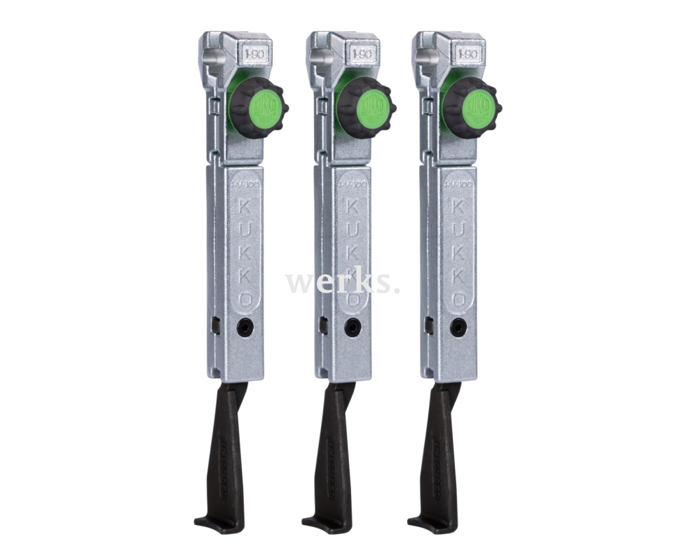 Комплект из трёх узких быстрорегулируемых съёмных захватов подходит для универсальных трёхлапковых съёмников. Узкие захваты обеспечивают доступ даже к узким и труднодоступным местам. Зелёные рифлёные ручки обеспечивают максимальный комфорт в работе и позволяют быстро, без инструментов, ослаблять и затягивать захваты даже мокрыми или масляными руками. Благодаря свободно перемещающимся по траверсе захватам, можно снимать даже эксцентриковые детали. Насечка обеспечивает быстрое освобождение и перемещение захвата без инструментов.