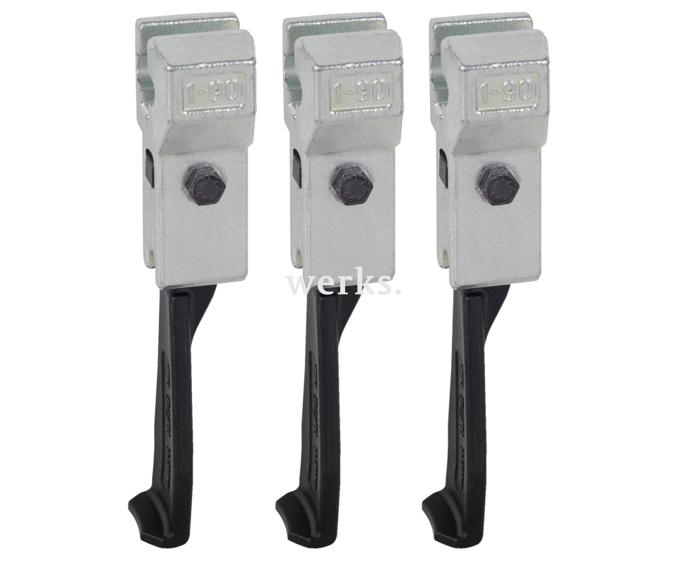 Комплект из трёх очень узких съёмных захватов подходит для универсальных трёхлапковых съёмников. Трапециевидная опорная поверхность захвата обеспечивает доступ даже к очень узким и труднодоступным местам. Благодаря свободно движущимся по траверсе захватам, можно снимать даже эксцентричные детали.