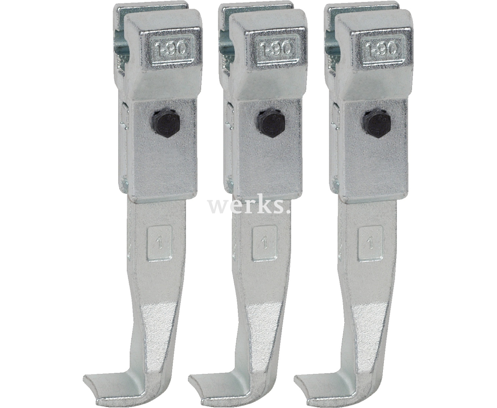 Комплект из трёх стандартных захватов подходит для трёхлапковых универсальных съёмников. Прочные захваты обеспечивают особенно безопасный демонтаж подшипников, шестерён и дисков. Благодаря свободно перемещающимся захватам, скользящим по траверсе, можно снимать даже эксцентричные детали.