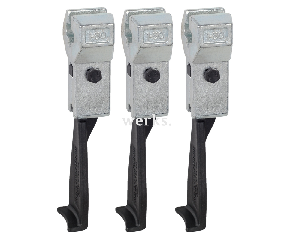 Комплект из трёх узких съёмных захватов подходит для универсальных трёхлапковых съёмников. Узкие захваты обеспечивают доступ даже к узким и труднодоступным местам. Благодаря свободно движущимся по траверсе захватам, можно снимать даже эксцентричные детали.